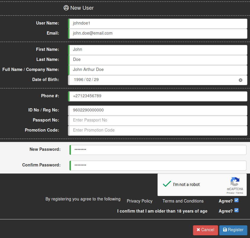 - Passport No - If you do not have a South African ID number or registration number, you can alternatively use your passport number.
