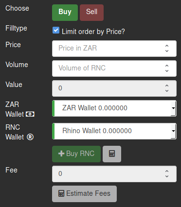 - Choose Buy if you want to buy the currency (e.g. on the ZAR/RNC exchange, you will be buying RNC with ZAR) or choose Sell if you want to sell currency (e.g. on the ZAR/RNC exchange, you will be selling RNC in exchange for ZAR).