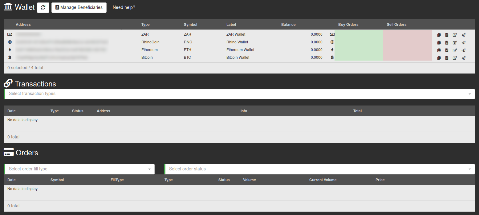 Once you are on the wallet page, you will find three tables, each of which is described below.